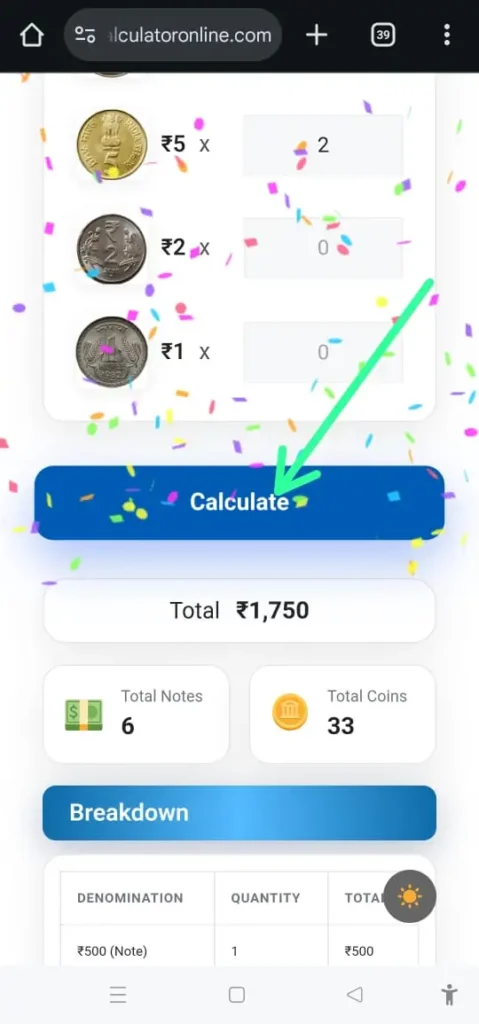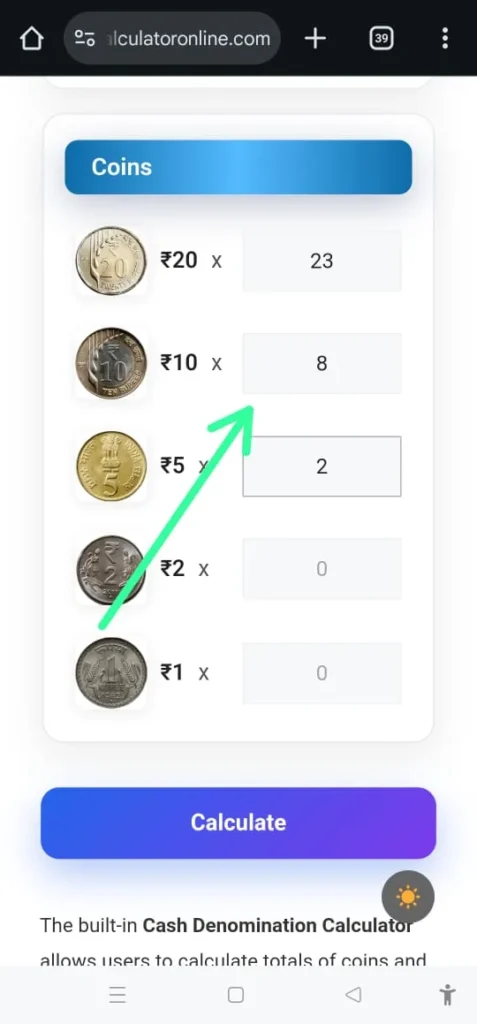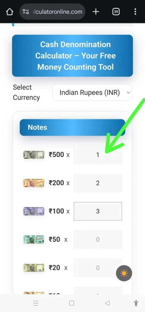 In the calculator, you’ll see different denominations (like ₹2000, ₹500, ₹100, or $100, $50, $20, etc.). Simply enter how many notes or coins you have in each denomination.