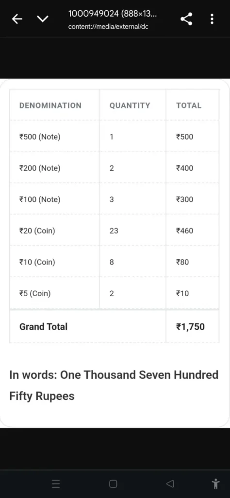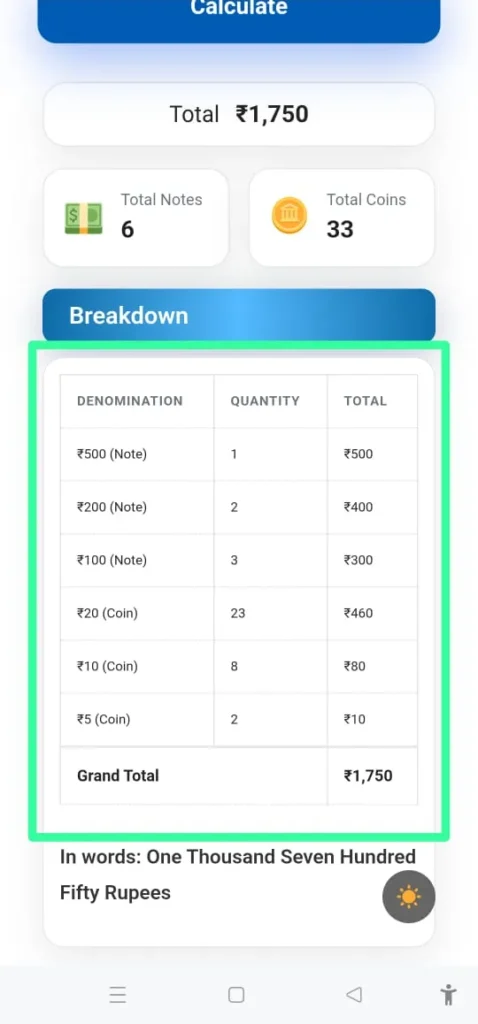 Along with the total, you also get a clear breakdown table that shows each denomination, its quantity, and the total value. This is especially useful for businesses, cashiers, and shopkeepers who need transparent records.