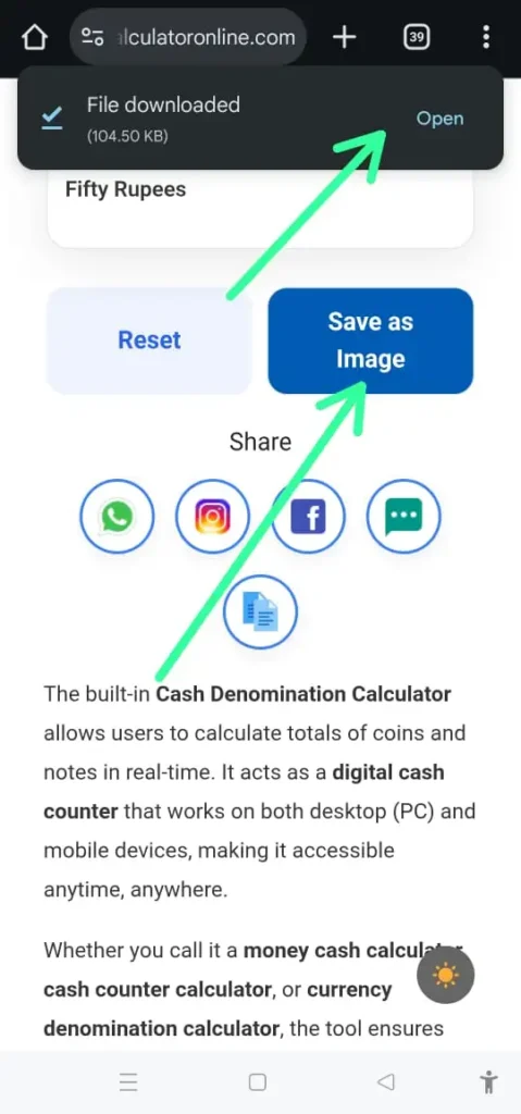 Once your calculation is done, you can save the result as an image with one click. This feature is especially useful for shopkeepers, accountants, and business owners who want to keep records or share the summary instantly via WhatsApp, email, or social media.